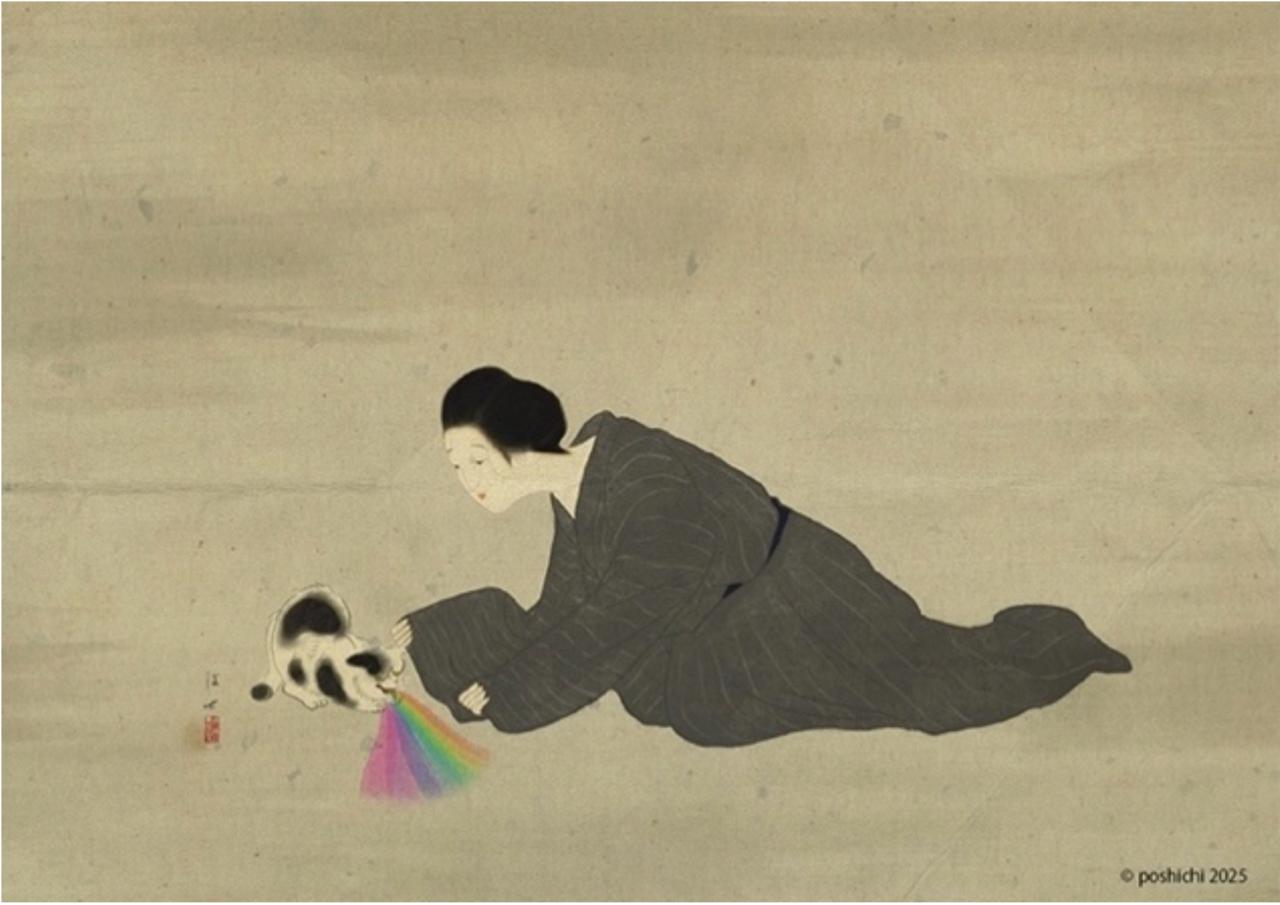 During the pandemic, the artist began drawing at the encouragement of a friend, setting out to explore how far digital art could recreate the texture and presence of an original artwork. Works created on an iPad were shared on social media, where the artist continues to be active, creating pieces that combine classical Japanese imagery with contemporary themes. Recent works focus on everyday life with a rescue cat adopted into the artist’s home, as well as encounters and interactions with animals along the way.
